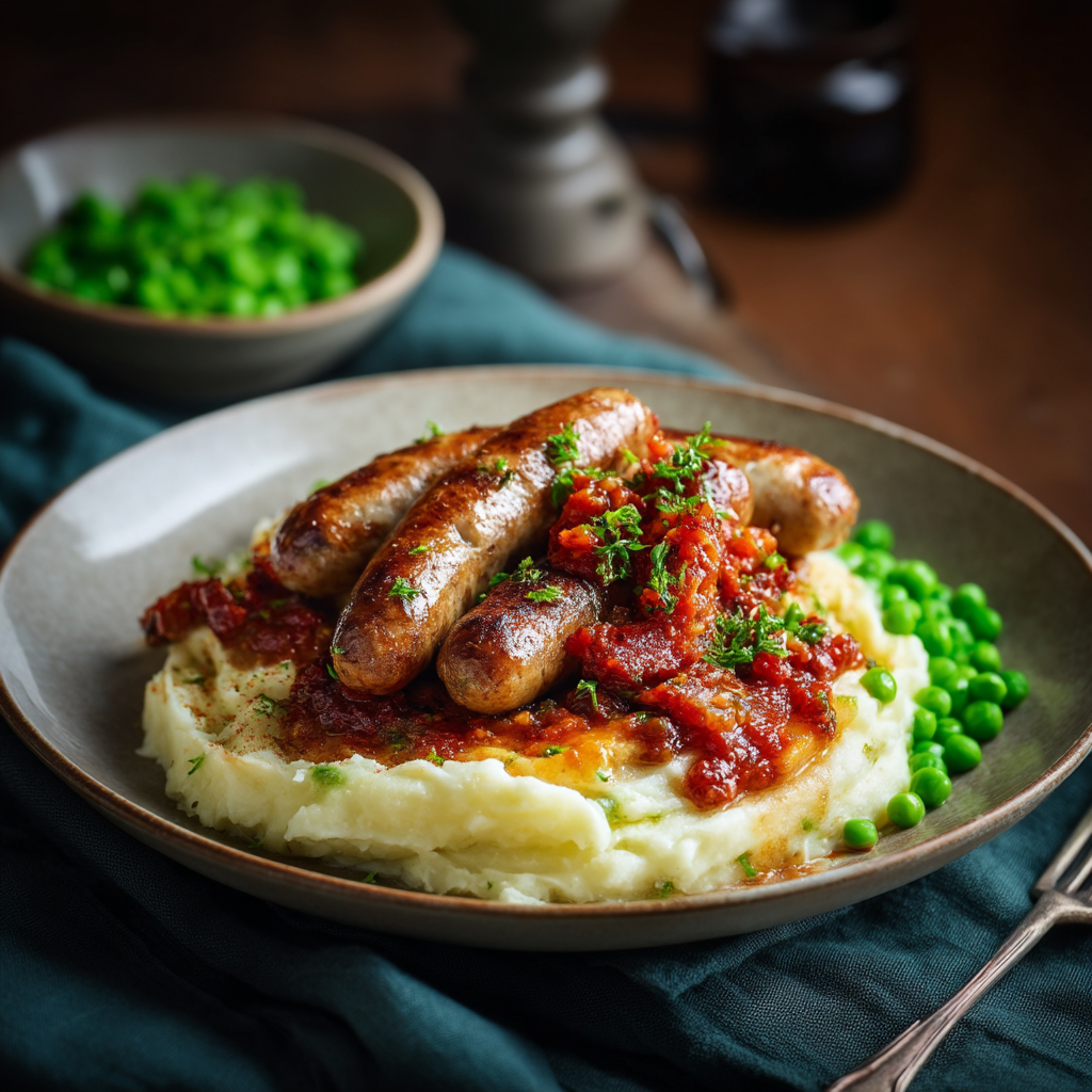 Beef Sausages (40%)(Beef (75%), Water, Rice Flour, Salt, Mineral Salt (451), Preservative (223)(Sulphites), Soy Flour, Antioxidant (316), Vegetable Oil, Colour (160c), Herb Extract, Vitamin E (307b), Spice Extract, Natural Flavour), Potato (25%)(Potato (76%), Reconstituted Milk, Butter (Milk)(5%), Salt, White Pepper), Tomato Relish (21%)(Tomato (52%)((Tomatoes, Firming Agent 509)), Sugar, Vinegar, Water, Onion, Modified Starch (1422), Tomato Paste, Salt, Garlic, Mustard Seed, Spices, Citric Acid), Peas (14%).