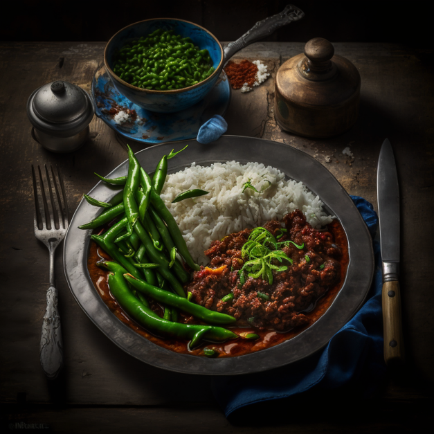 The dish is served on a bed of fluffy white rice, helping to soak up the delicious sauce, providing a comforting and filling base for the meal. The green beans add a healthy dose of fibre and vitamins, balancing out the richness of the beef and the spiciness of the sauce.