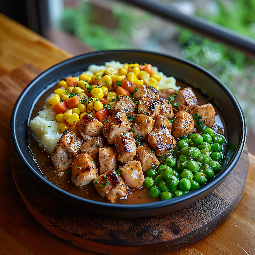 This dish features succulent chicken breast, generously smothered in a rich, savoury gravy on a hearty bed of satisfyingly creamy mashed potatoes. Adding a burst of colour and variety to the plate are the old-time classic vegetables, a mix of peas and corn.