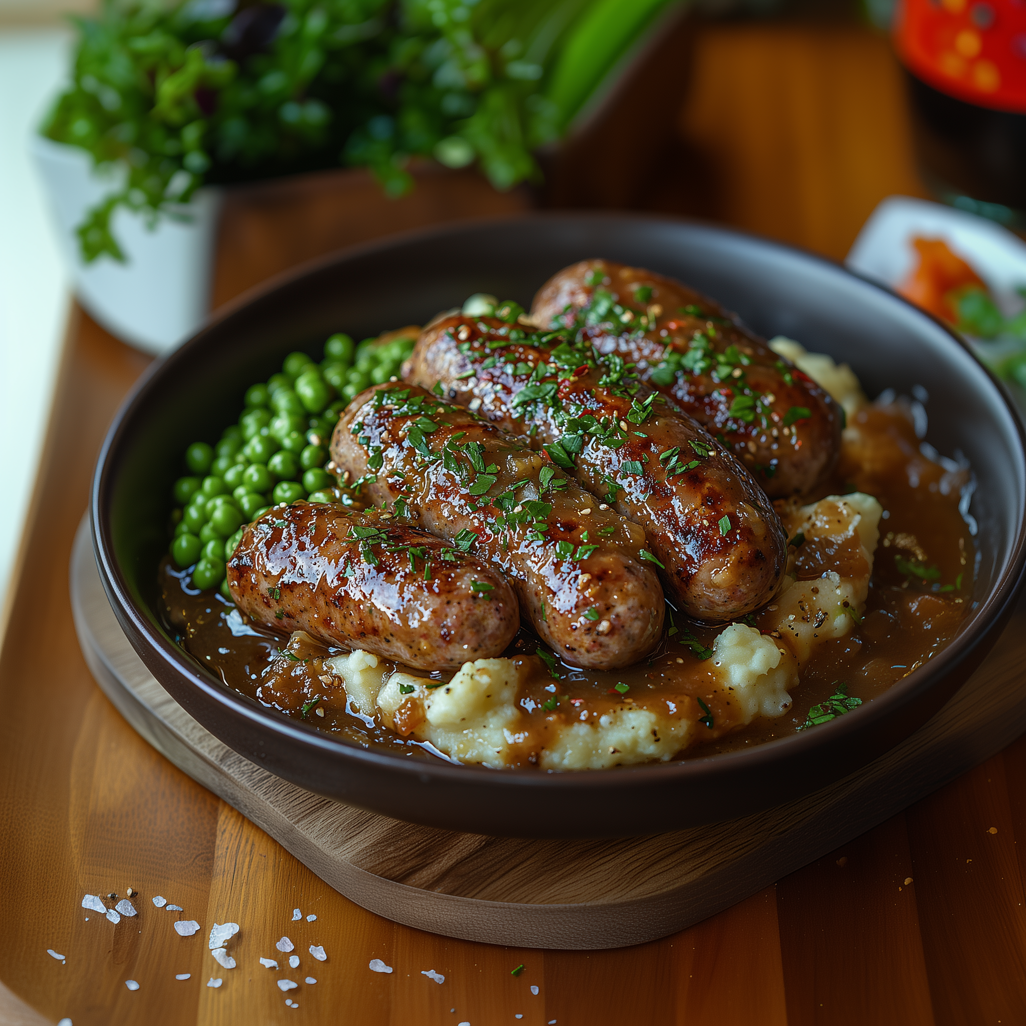 Beef sausages, mashed potato, and peas coated in onion gravy is a hearty, satisfying meal that's perfect for chilly evenings or cosy family dinners. Nestled amongst mountains of mash you’ll find tasty protein-rich beef sausages, doused in our signature gravy. As the stand-out of this meal, the rich, savoury onion gravy coats everything in a deliciously sweet and tangy flavour. Made with slow-cooked onions, beef stock and a blend of herbs and spices, the gravy brings all the flavours of the dish together, adding a touch of warmth and comfort to every bite. Rounding out the meal with a healthy dose of vitamins and fibre, the peas add a pop of colour and freshness to the dish.