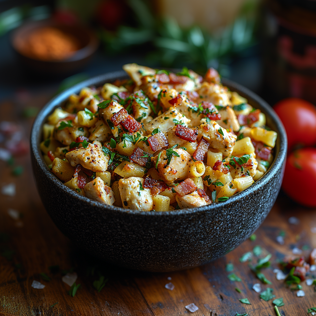 Indulge in our Chicken & Bacon Creamy Macaroni, a delicious twist on the beloved classic macaroni and cheese. Tender chunks of chicken and bacon are enveloped in a rich, velvety sauce that perfectly coats each piece of macaroni.