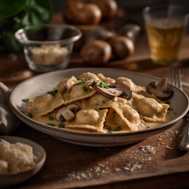 Accompanying the ravioli is a luxurious mushroom sauce, made with fresh cream and sautéed mushrooms, adding a deep, earthy flavor that compliments the lightness of the ravioli. The sauce is infused with a blend of aromatic herbs and spices, which enhances the richness of the dish and brings out the natural sweetness of the mushrooms.