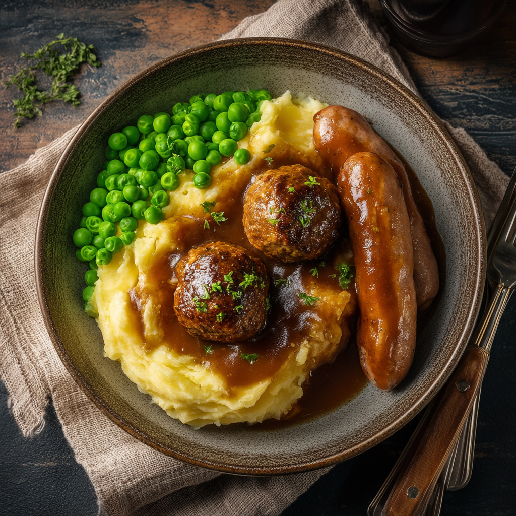 Potato (25%)(Potato (76%), Reconstituted Milk, Butter (Milk)(5%), Salt, White Pepper), Onion Gravy (21%)(Water, Onion, Demi Glaze (Maltodextrin, Corn Starch, Natural Flavours, Onion Powder, Milk Solids, Tomato, Vegetable Extract, Burnt Sugar, Salt, Food Acid), Meatballs (21%)(Beef, Onion, Water, Sugar, Garlic, Wheat Flour, Salt, Yeast, Sugar), Beef Sausages (20%)(Beef (75%), Water, Rice Flour, Salt, Mineral Salt (451), Preservative (223)(Sulphites), Soy Flour, Antioxidant (316), Vegetable Oil, Colour (160c), Herb Extract, Vitamin E (307b), Spice Extract, Natural Flavour), Peas.